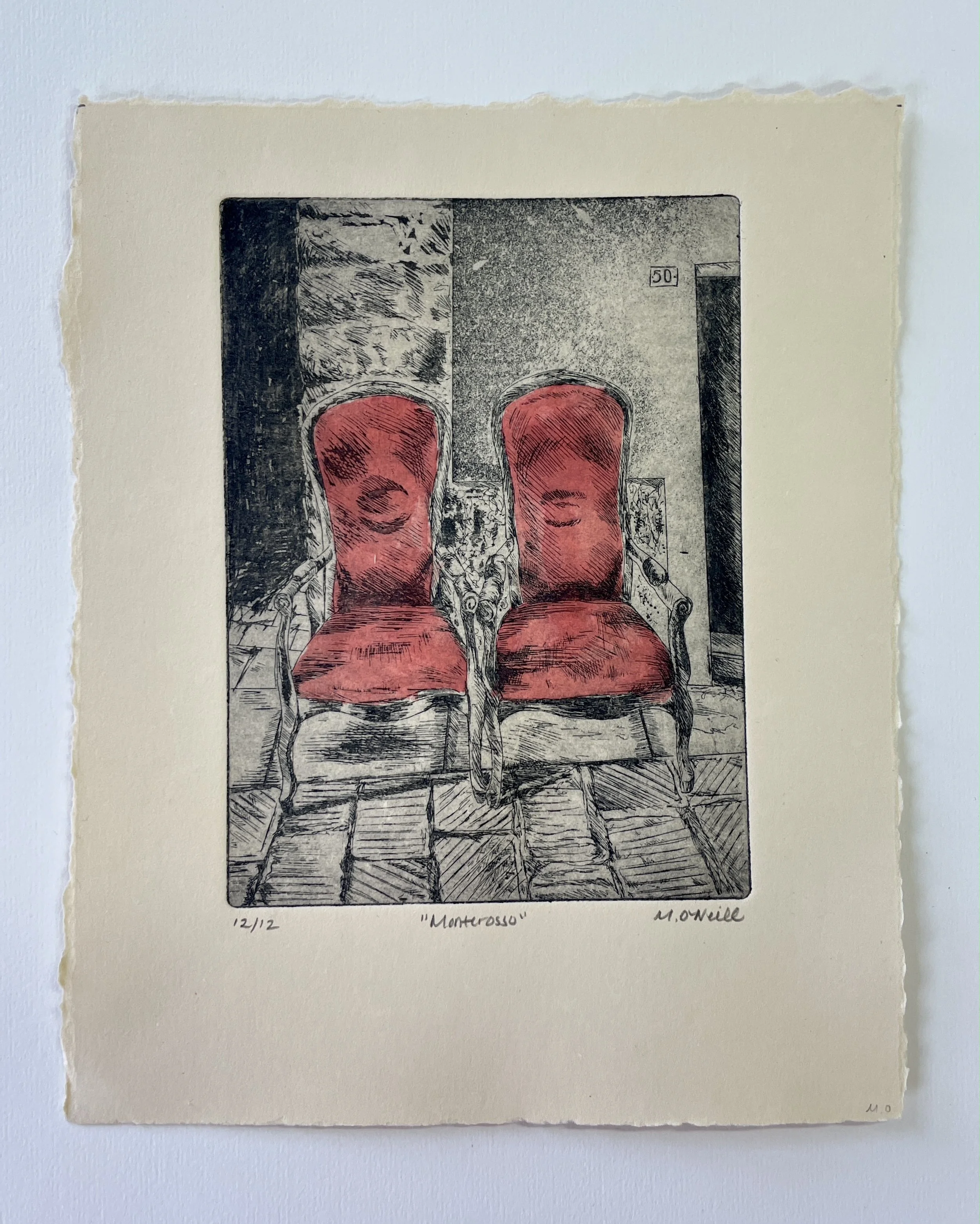 I chose to make a hard-ground watching of two chairs I saw on the streets of Monterosso. I thought that any picture captured in Cinque Terre could look like a postcard because of its natural beauty. These two red chairs stood out to me because they embodied age, partnership, and, romance. Using hard ground for the first time is satisfying because I was able to get so much more detail compared to soft ground. I also added aquatint to get a range of different textures. This method was fun to experiment with and I look forward to using it more in the future. For final touches, I used watercolor to paint the chairs red, which allowed them to stand out with such a busy background.